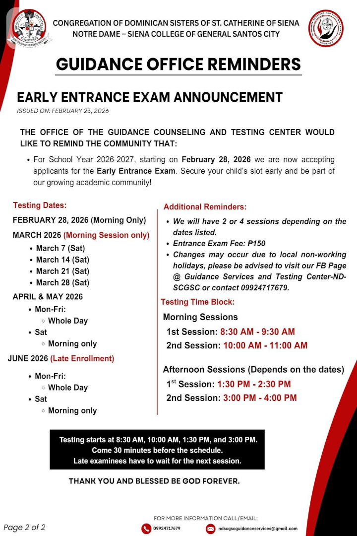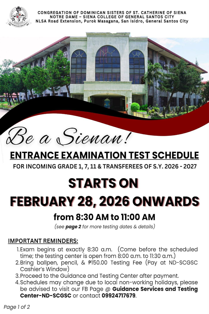 ND-SIENA COLLEGE GENSAN SCHOOL ANNOUNCEMENT